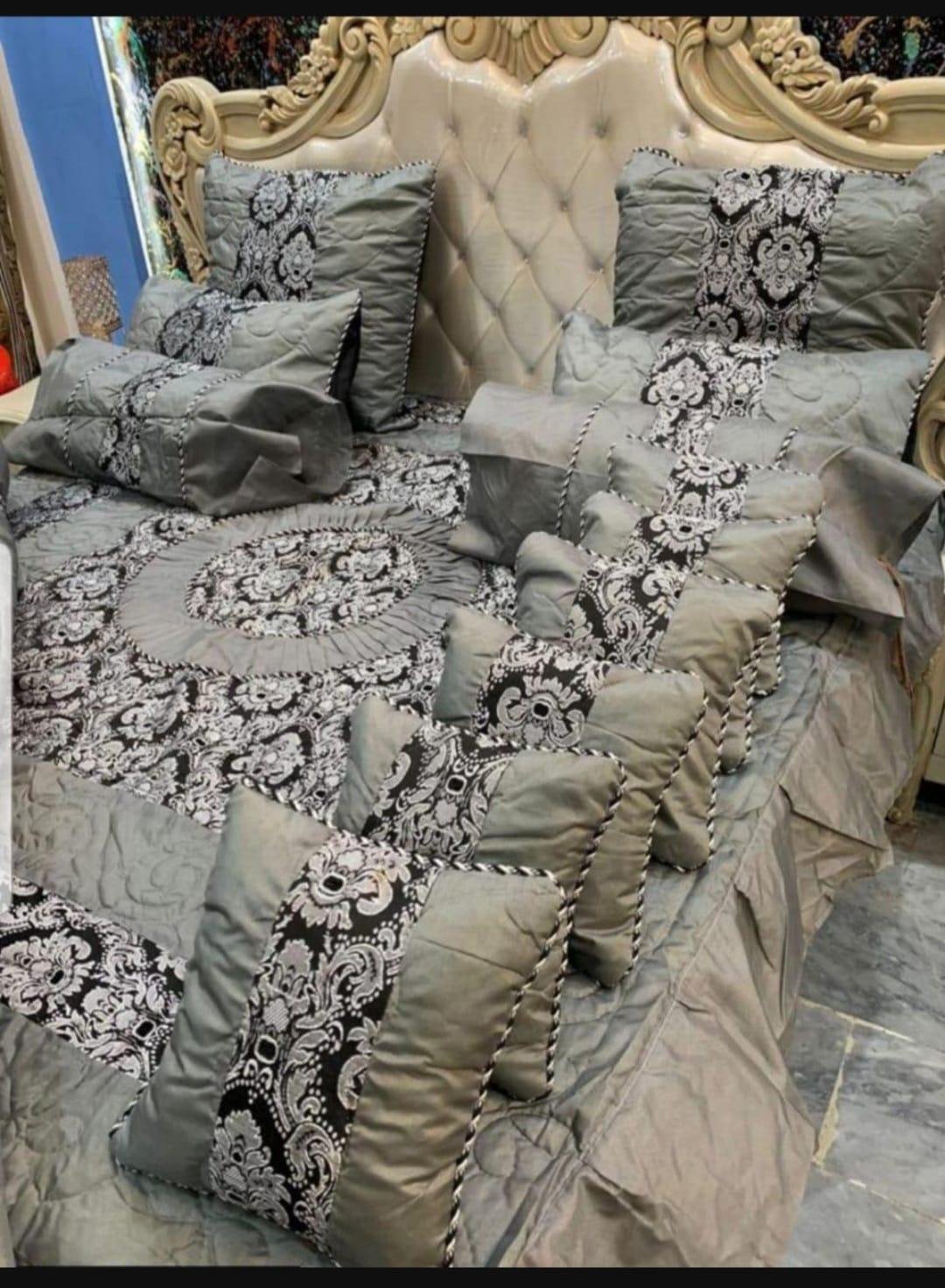 Create a majestic bedroom atmosphere with this stunning 14 Pcs Silk Jacquard Patchwork Razai Set, crafted for those who appreciate elegance and comfort. Featuring a sophisticated grey and black palette with ornate jacquard floral patterns and intricate patchwork detailing, this set delivers a true designer look worthy of luxury interiors.