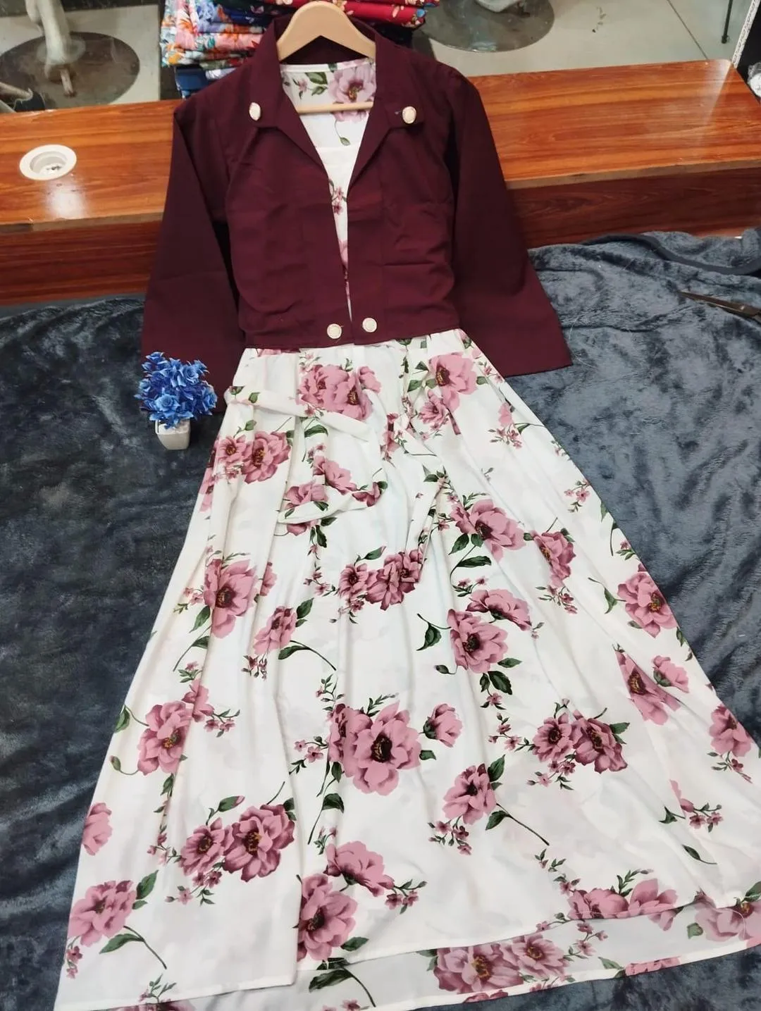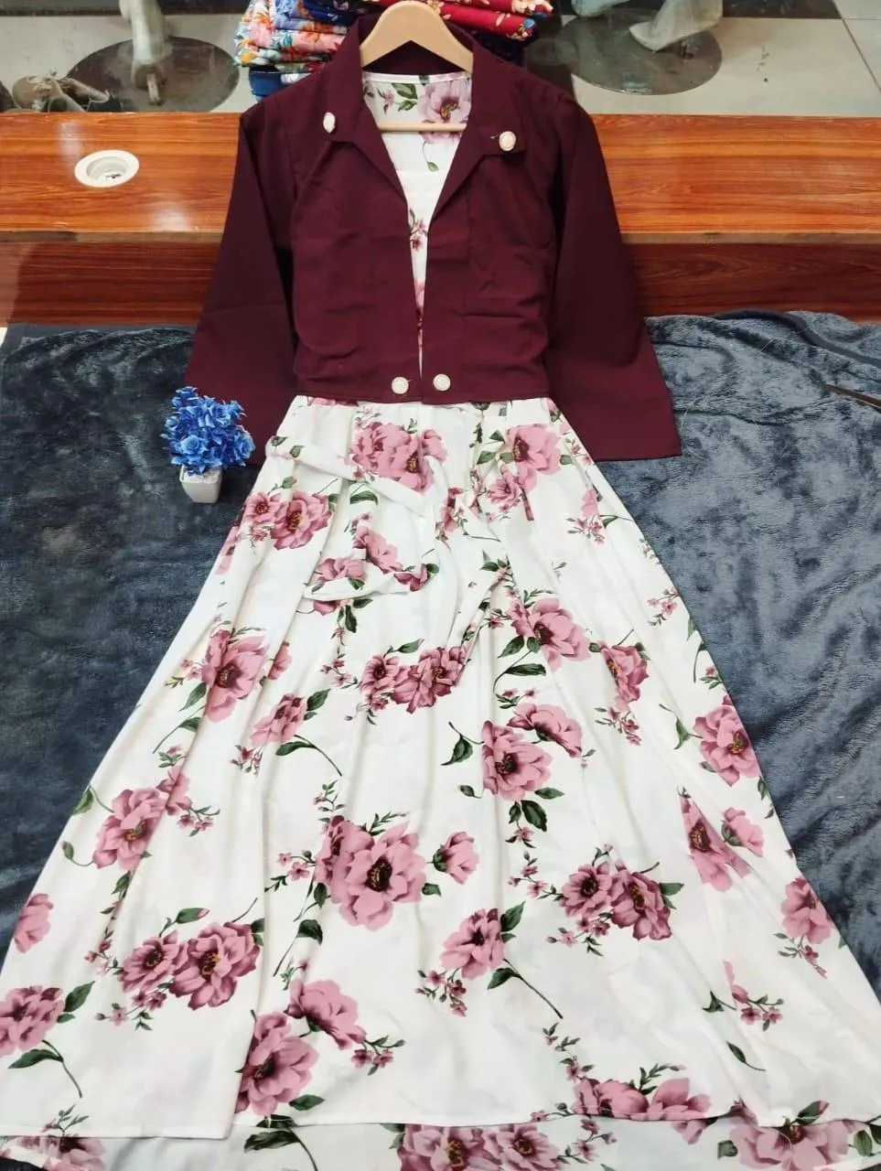 Enhance your festive and party look with this stunning 2-piece stitched georgette maxi dress paired with a stylish short jacket. Designed with a beautiful floral printed maxi and a contrasting solid jacket, this outfit gives a graceful and modern look.