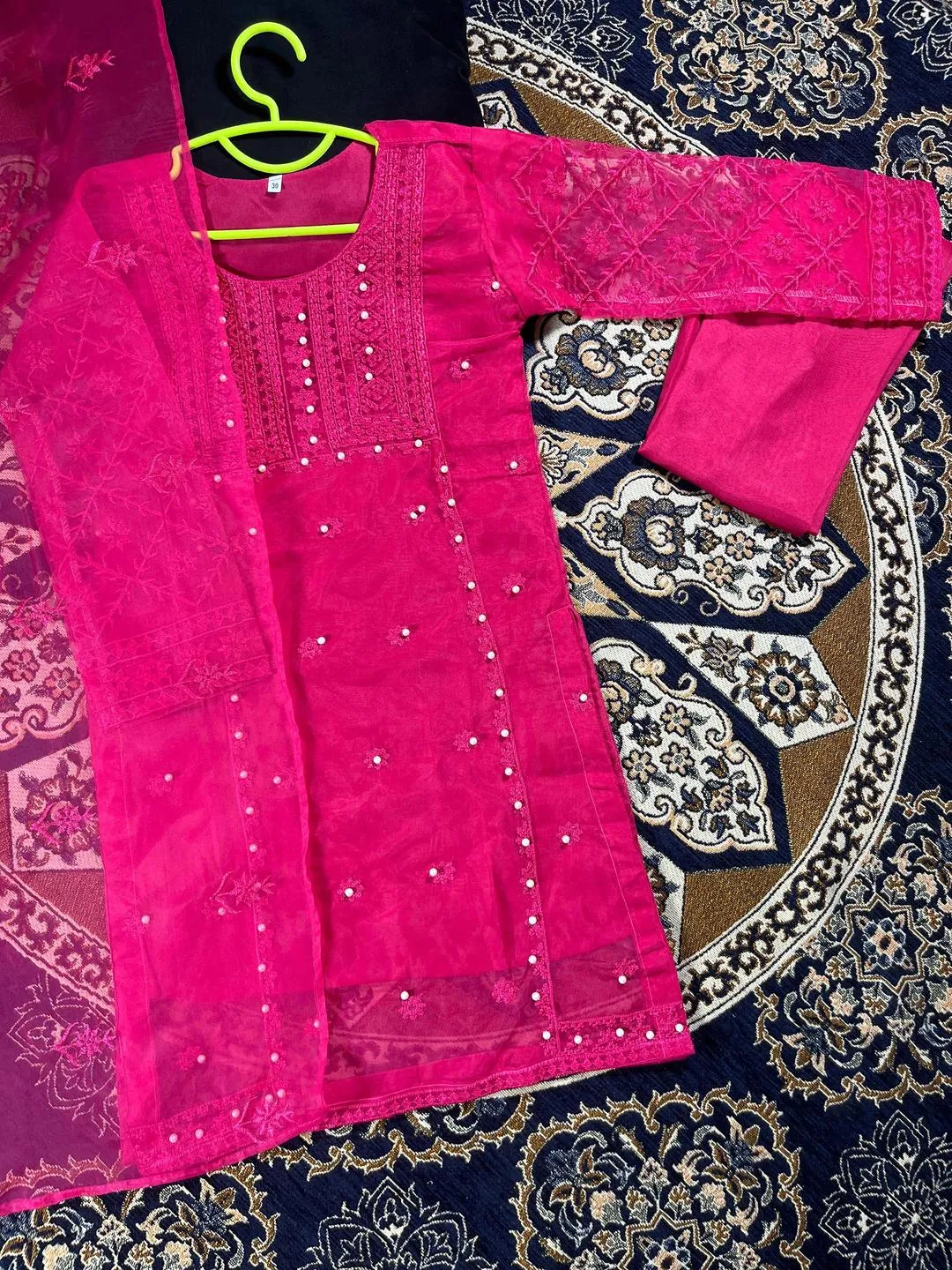 Celebrate in style with this stunning pink ensemble. This set features a high-quality Organza shirt adorned with heavy embroidery and hand-attached pearls for a sophisticated, luxury feel. Paired with comfortable Crepe trousers and a matching Organza dupatta, this outfit is fully lined and ready to wear, ensuring your child stays comfortable while looking like the star of the show.