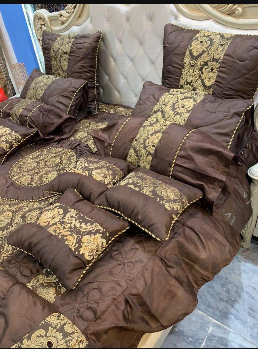 Give your bedroom a luxurious makeover with this beautifully designed 14-Piece King Size Razai Set, made from high-quality Silk Jacquard fabric. The rich patchwork pattern and warm brown tone add a touch of elegance and depth, creating a refined and cozy sleeping space.