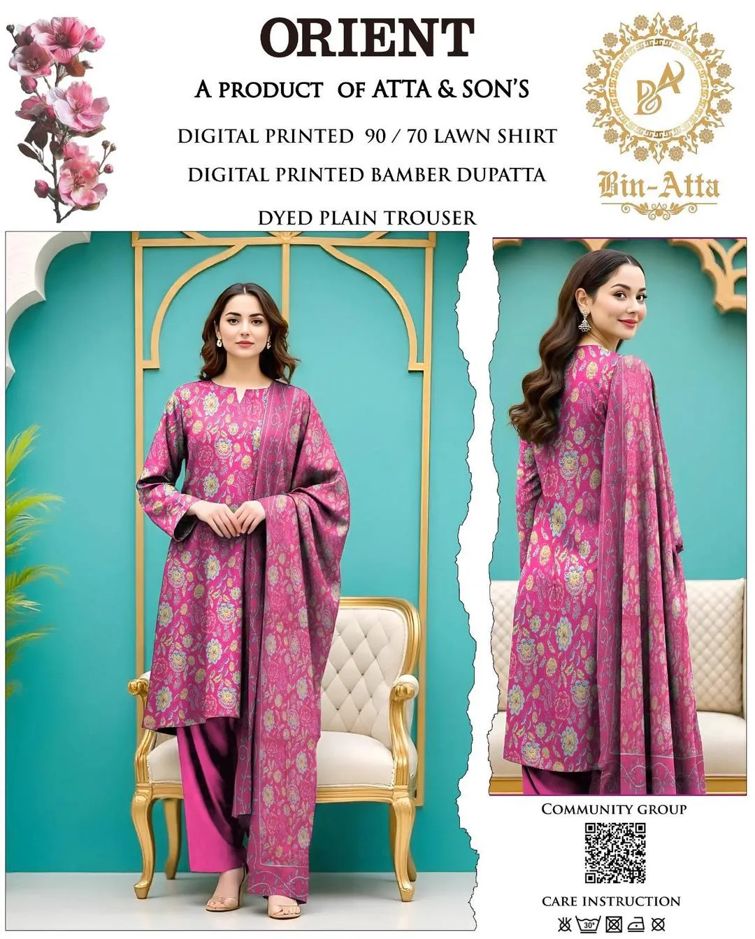 Step into elegance with our Rose Pink Digital Print Collection. This 3-piece unstitched set combines the breathability of high-grade Lawn with the sophisticated touch of a Bamber Dupatta.