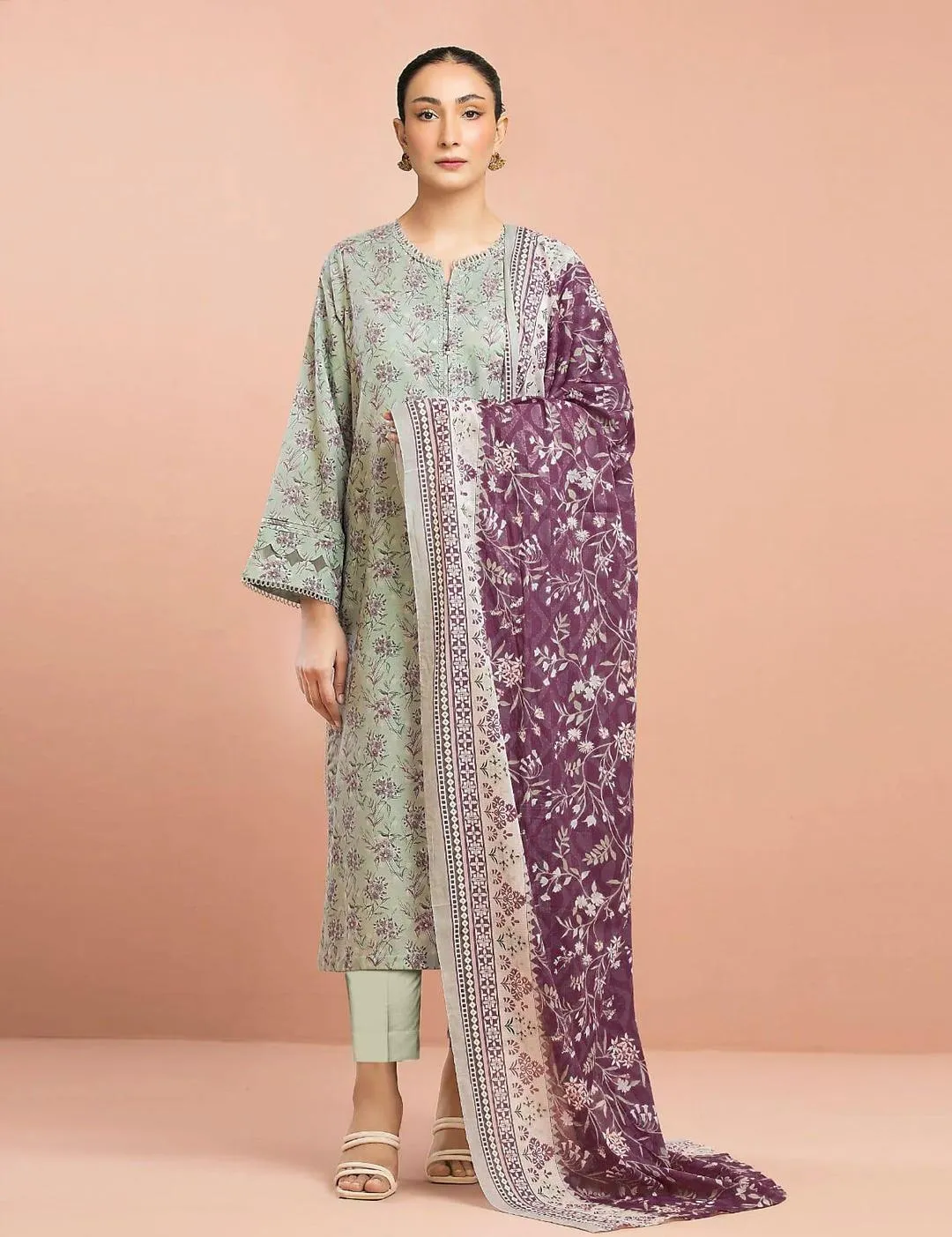 The set features vibrant, high-quality prints across the shirt and the matching Dobby Lawn dupatta. With a massive 3-meter shirt cutting, this suit is perfect for those who love heavy flares, long silhouettes, or creative designer stitching. Paired with a soft, plain lawn trouser to balance the look, this outfit is your go-to for summer brunches, festive gatherings, or breezy evening wear.