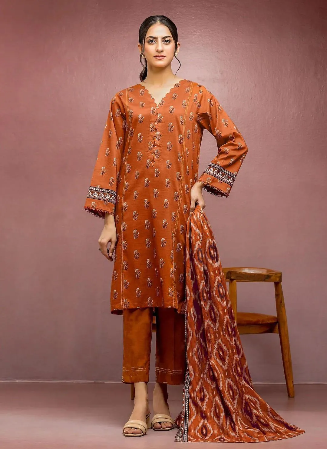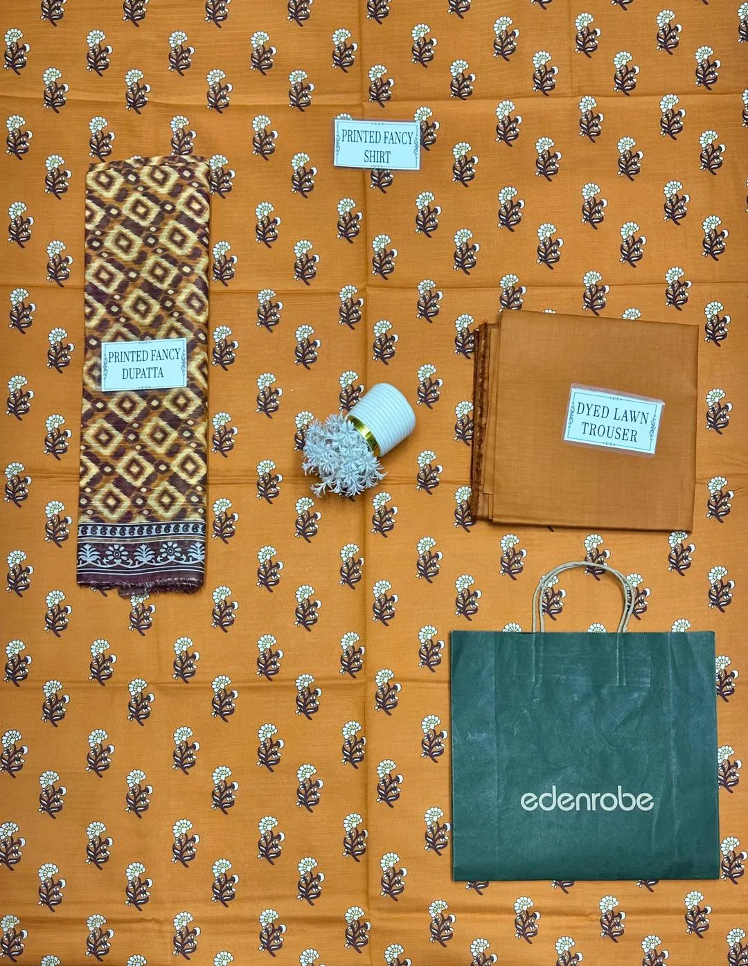 Title: Sunshine Orange 3-Piece Dobby Lawn Suit – Self-Textured Fabric with Designer Print
