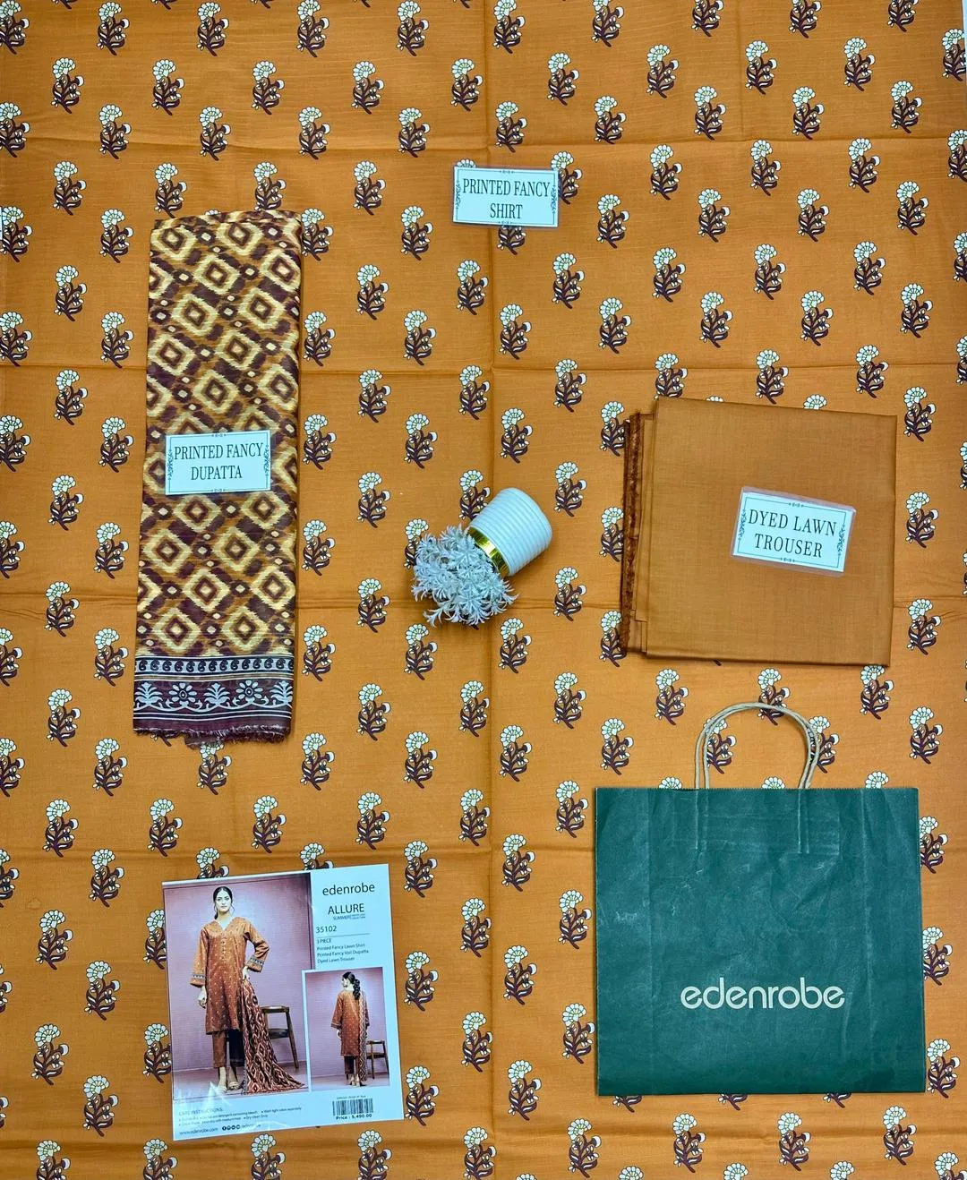 Be the first to review “Title: Sunshine Orange 3-Piece Dobby Lawn Suit – Self-Textured Fabric with Designer Print”